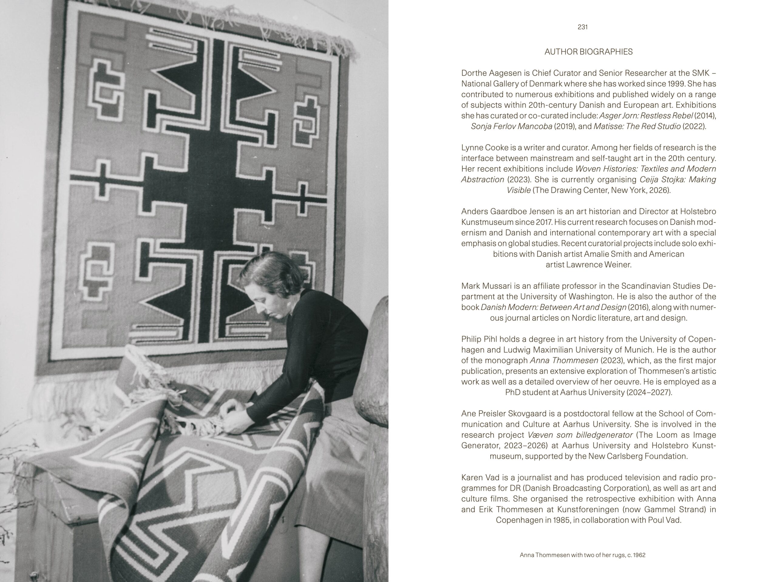 Textile artist Anna Thommesen (1908–2004) made an exceptional contribution to Danish art over five decades. Her distinctive rugs and tapestries, created for private homes and public institutions, are characterised by a rare artistic integrity. Through essays by renowned scholars and more than 100 works – rugs, tapestries, and watercolours, as well as pattern designs and yarn samples – this book offers fresh insight into Thommesen’s life and practice while also discussing the wider role of weaving within the history of modern art.
