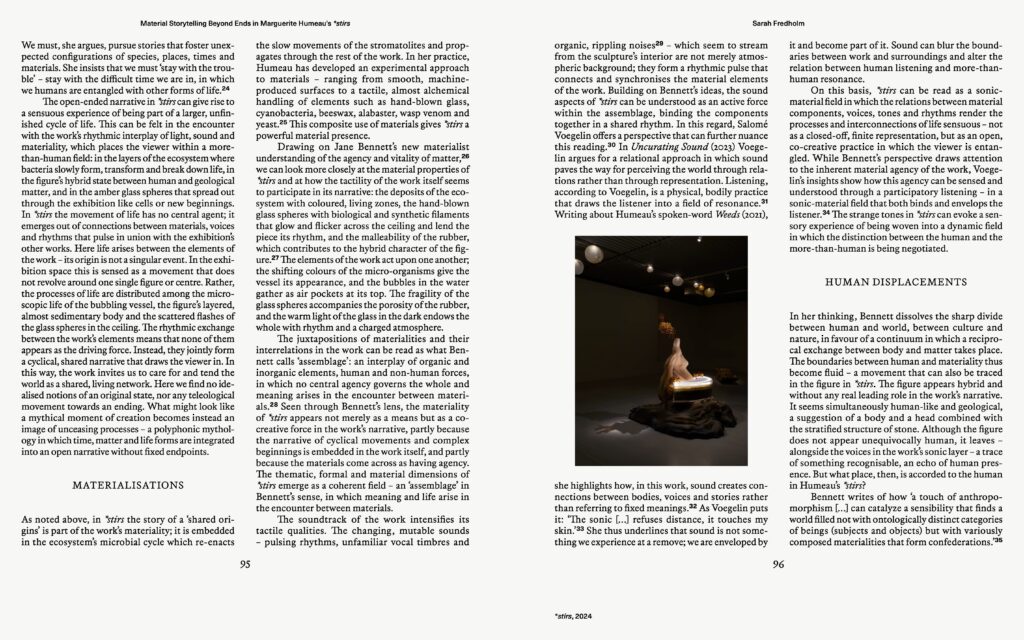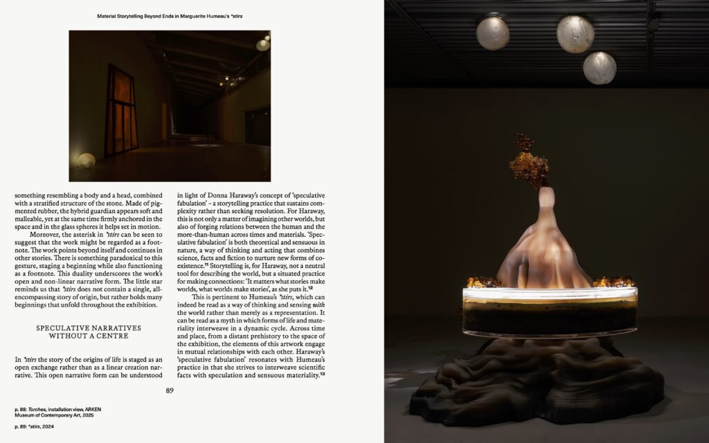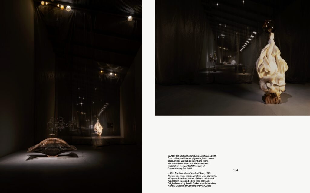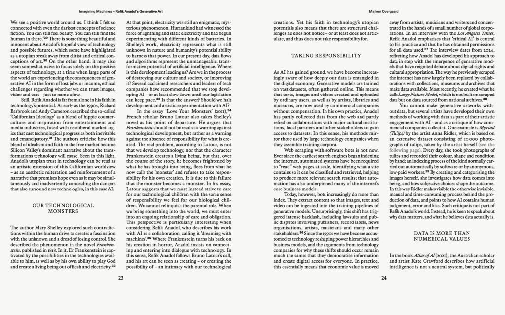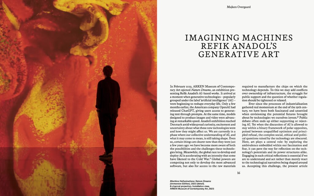 I denne publikation stiller kurator og researcher Majken Overgaard skarpt på Refik Anadols kunstneriske praksis og på hans brug af teknologi i en tid, hvor AI både fascinerer og skaber frygt. Kurator og naturfilosof Dehlia Hannah undersøger, hvordan Julian Charrière udforsker forholdet mellem mennesket og naturen. Kurator på ARKEN Sarah Fredholm ser nærmere på Marguerite Humeaus værk som en spekulativ mytologisk fortælling, hvor liv, materialitet og fortælling flettes sammen og åbner for en anden sanse- og forståelsesmæssig relation til verden.